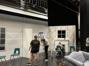 Members of stage crew, along with cast members, help paint the walls of the set before rehearsal. |
