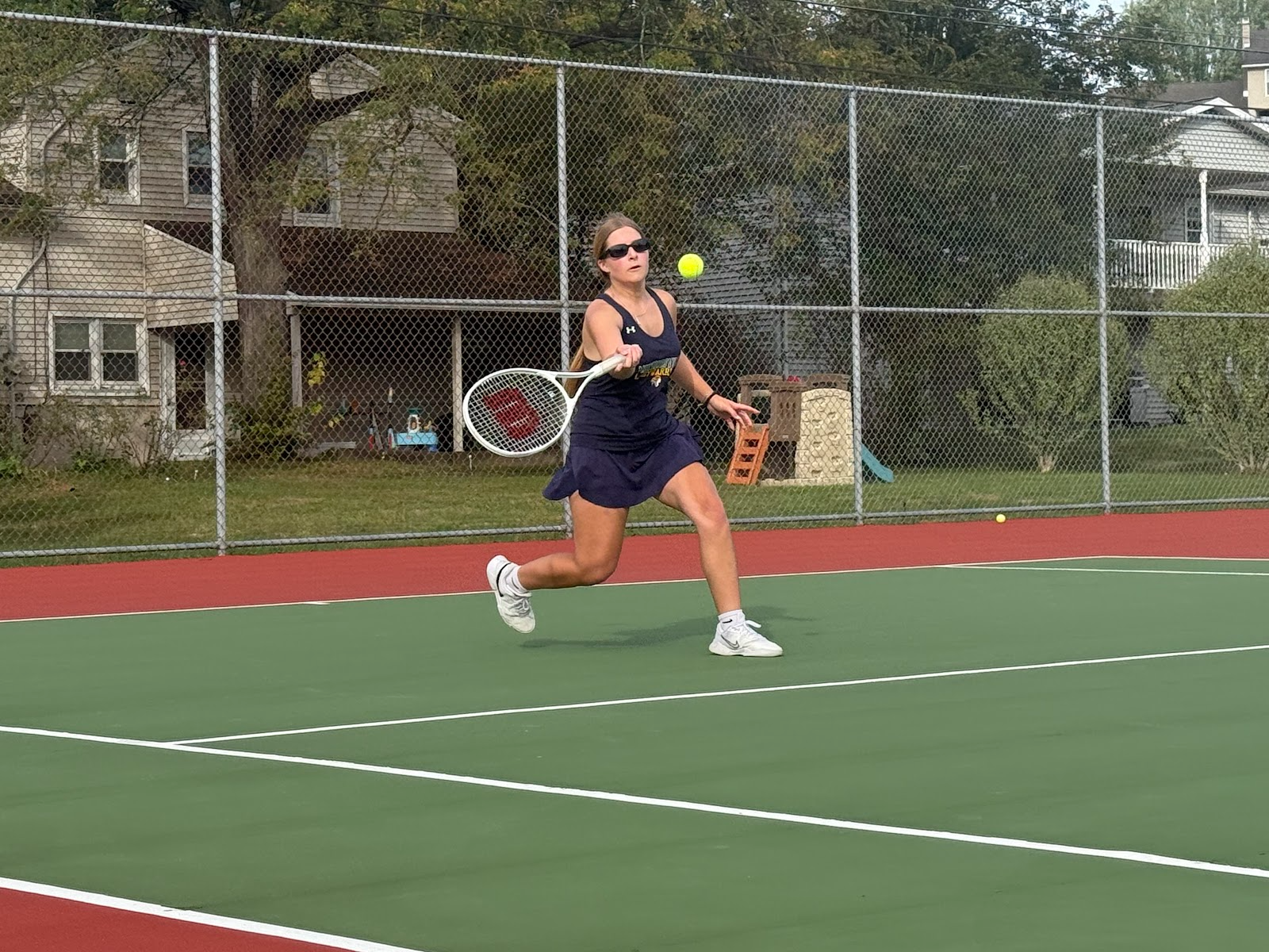 Featured photo (at top): Junior Analiese Crossen returns a serve during her doubles match against Bloomsburg. Crossen and her partner, junior Ava Barto, played two incredible sets that match, winning Montoursville another point against Bloomsburg. Photo by Sophia Perez
