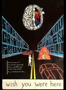 For this month, I would like to shine the senior spotlight on Carlos Tira. I have had the privilege of knowing Carlos for many years now and he is nowhere short of the perfect friend. He is always smiling, helping others and being kind, and he is constantly going above and beyond when it comes to participating in the something that he loves. Football, band, and art are just a few of the things that Carlos spends his time doing. After just finishing up his varsity football career, Carlos revealed a project that he had been working on. He called it, “Wish You Were Here”. The piece is inspired by the Pink Floyd song, addressing one of the band members who left the group due to mental health struggles and drug use. After senior Lillian McCulloch requested a piece from Carlos to use for her Teen Talk podcast which promotes mental health awareness, Carlos came up with this. Awesome work, Carlos!