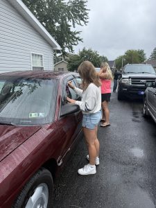 Seniors Lindsay Garber and Lillian McCulloch work on painting the windows of McCulloch’s car. Their group of friends got together on the last day of summer vacation to have brunch and use paint markers to decorate their cars for the big day. Photo taken by Jamie Burns