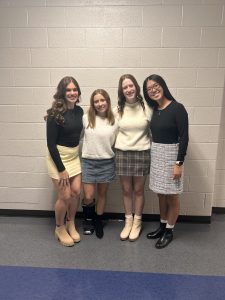 From left to right: Seniors Elizabeth Wanner, Lindsay Garber, Savanna Farley, and Evelyn Weng smile for a picture together. The four of them had found out just two days prior that they were on Homecoming Court and would get to dress up for the formal picture in the courtyard. Photo provided by Lindsay Garber