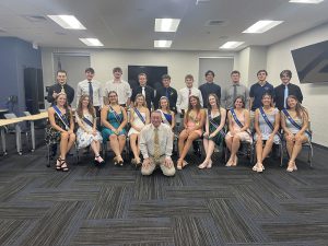 The Homecoming Court and Mr. Richard Delong smile for one last picture together during the Homecoming dance. The dance was hosted by Student Government on September 27, and the Princess and Queen had already been announced at the football game so it was a stress-free night for the group of girls. Photo taken by Rowan Fortin