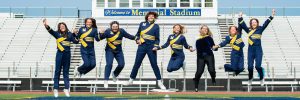 From left to right: Evelyn Weng, Alice Ravert, Grace Barkauskas, Reese Peterson, Lea Beishline, Lillian McCulloch, Lindsay Garber, and Savanna Farley all jump for a picture during their senior band member photoshoot. The group really bonded and got close over the last five years they spent in marching band together. Photo taken by Albright Studios