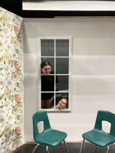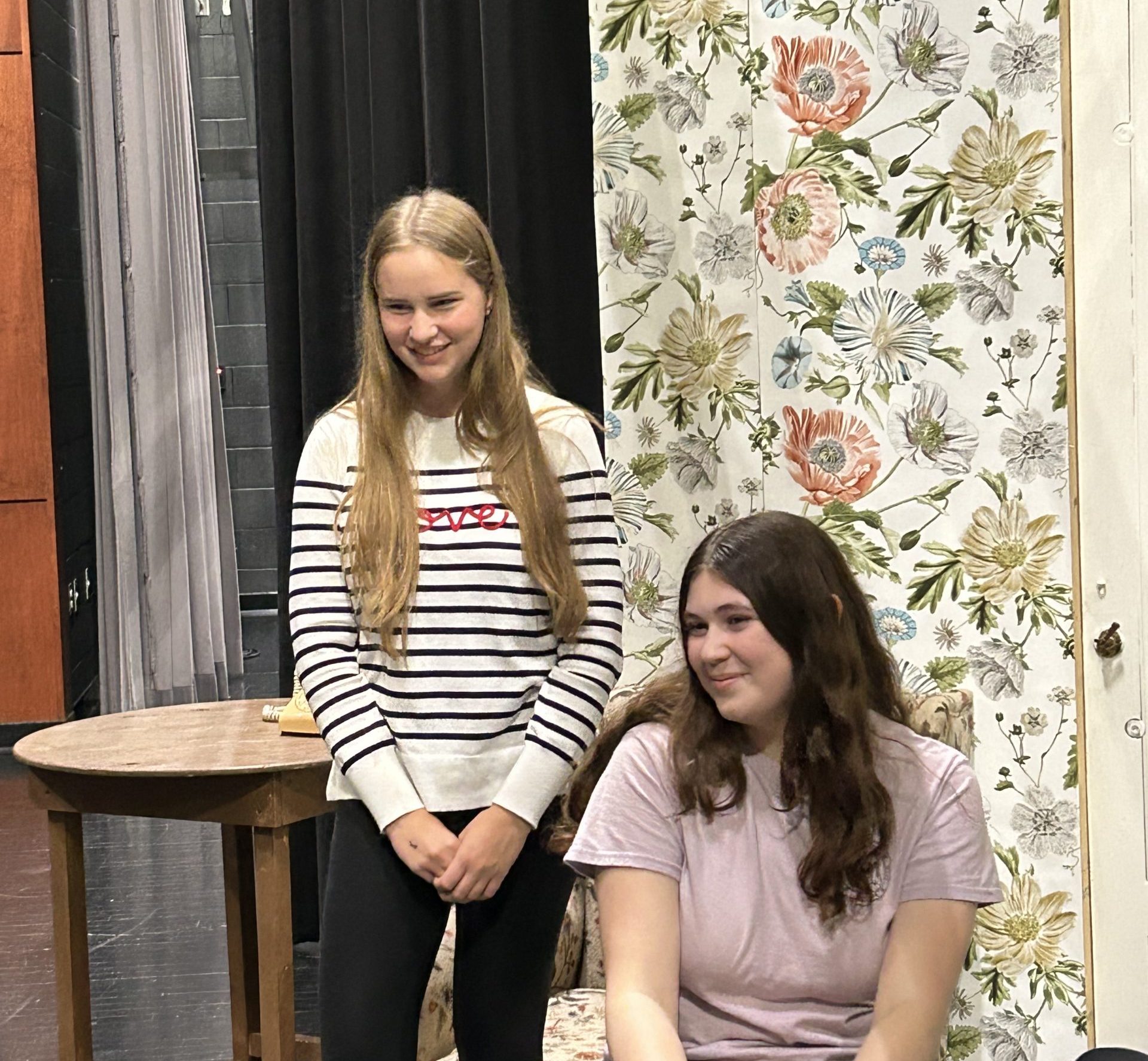 Cast members Grace Barkauskas and Lilly McCulloch pose for a silly picture in the window frame. |