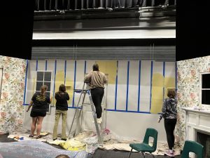 Members of stage crew, along with cast members, help paint the walls of the set before rehearsal. |